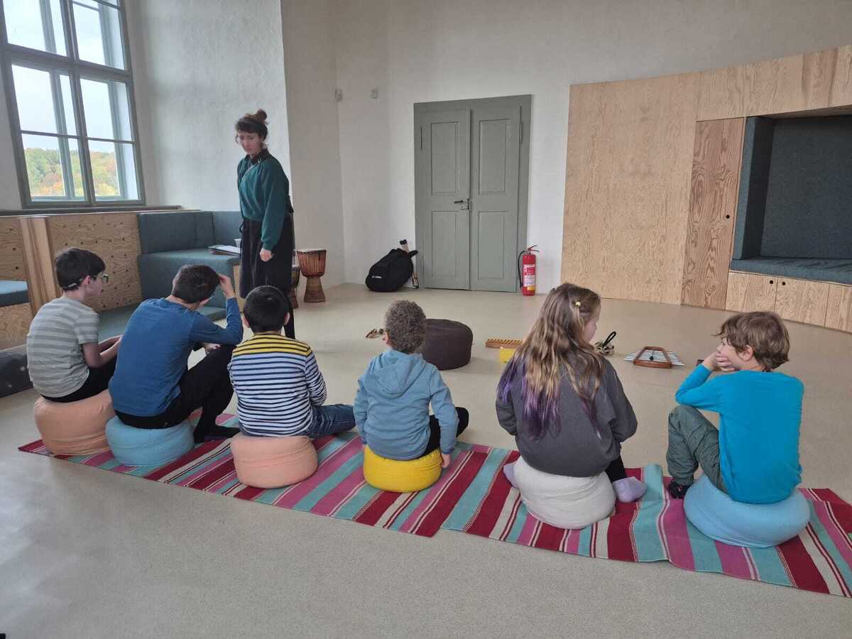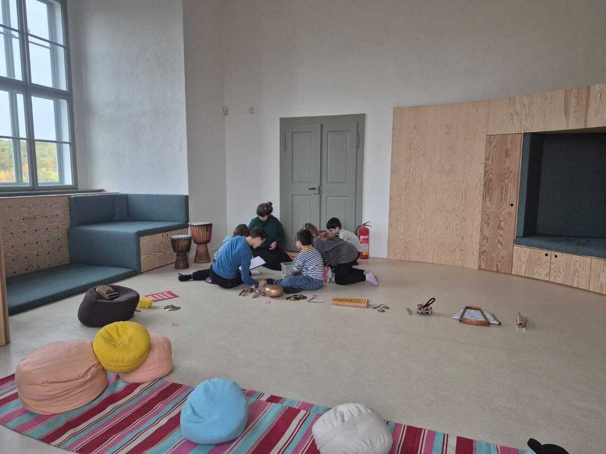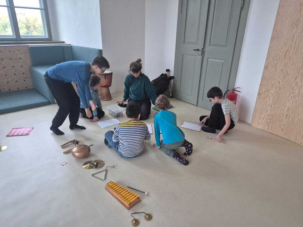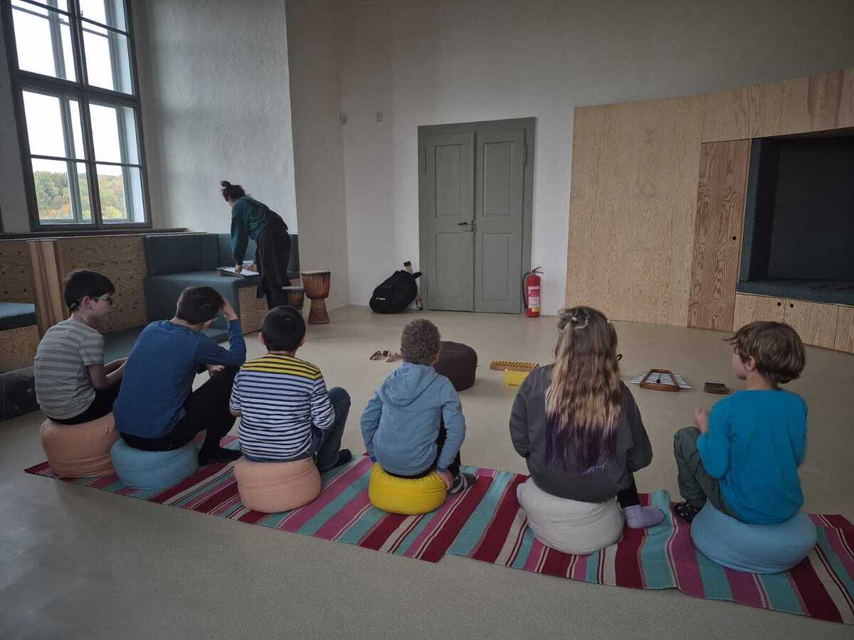 Děti měly možnost vyzkoušet si různé hudební nástroje, vnímat jejich zvuk a vytvářet melodie v závislosti na emocích. Poté se ponořily do relaxace s prvky imaginace, při které se nechávaly unášet na křídlech ptáčka nad Kutnou Horou, následně měly možnost výtvarně zachytit to, co si během relaxace představovaly. V neposlední řadě jsme se šli podívat i na část expozice.